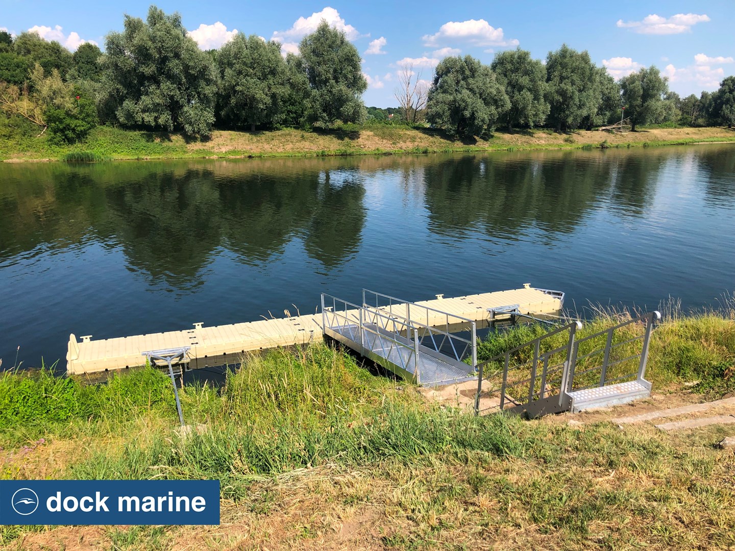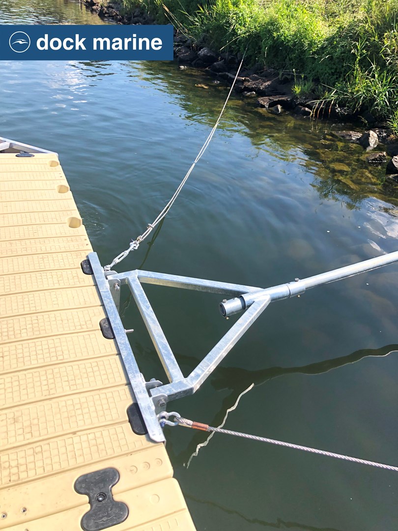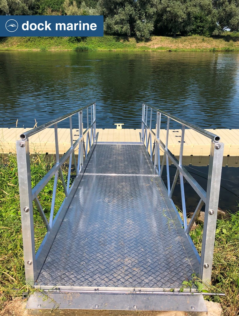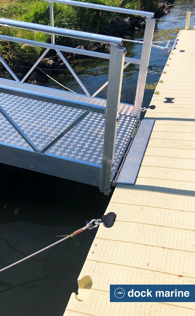 L'accès au ponton est facilité par une passerelle en aluminium de 6 mètres, couplée à un escalier sécurisé. L’ensemble est solidement ancré par deux bracons, garantissant à la fois la stabilité de la structure et une liberté de mouvement adaptée aux variations du niveau d’eau.